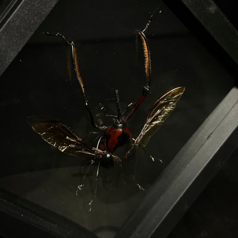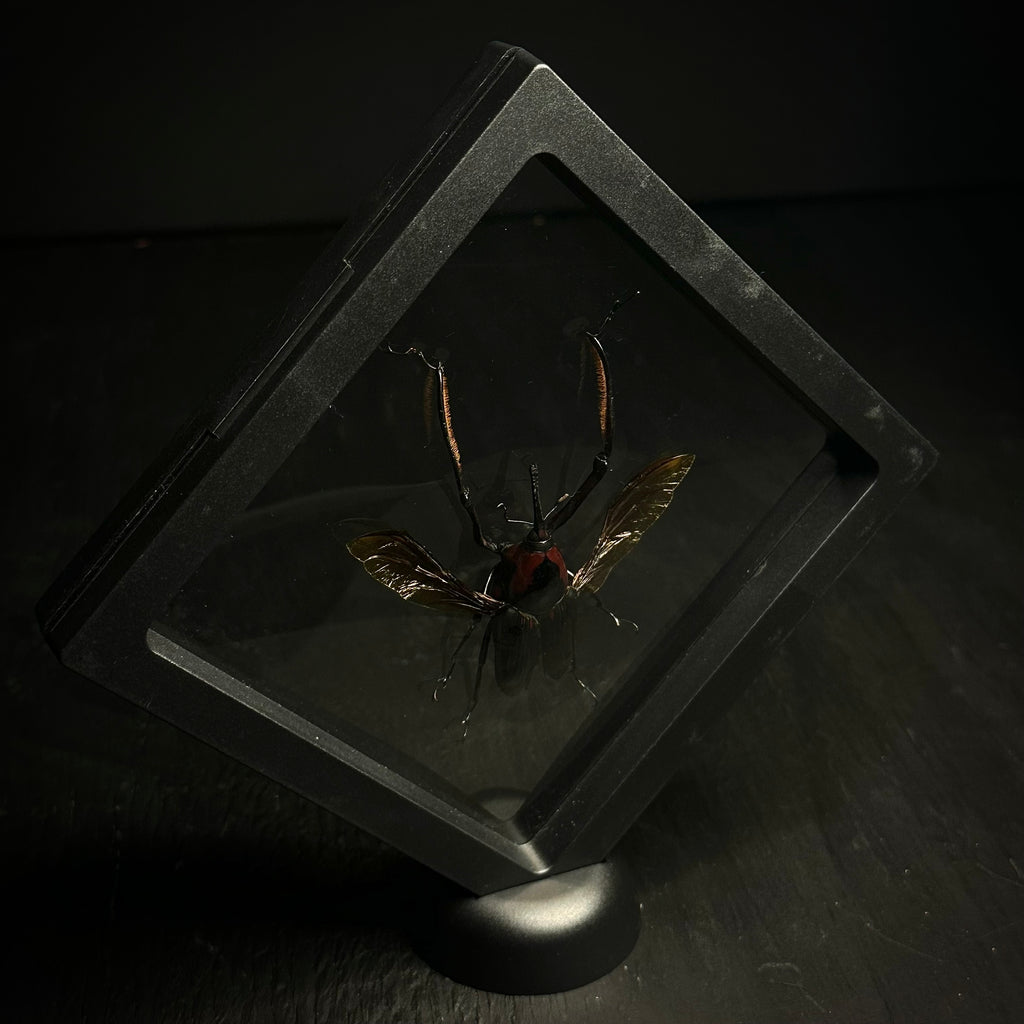 Real Giant Bamboo weevil dry preserved and mounted in a 5" X 5" plastic frame with stand.