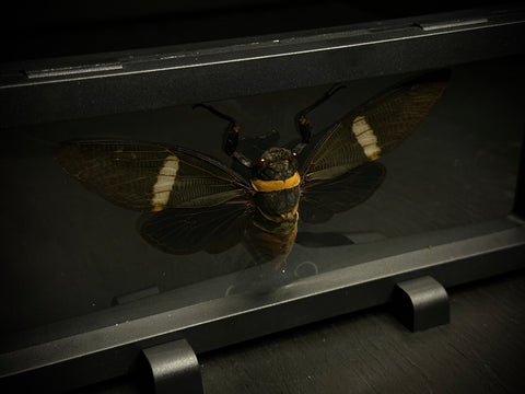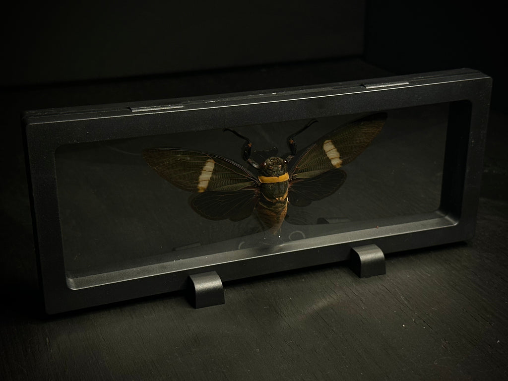 Real Giant Black cicada dry preserved and mounted in a 9" x 3" plastic frame with stand.