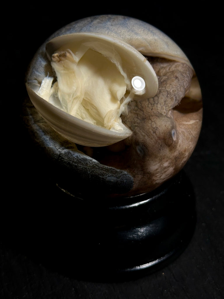 Real clam and sea life specimens preserved in fluid and sealed inside a 2.5" glass globe with a black resin base.