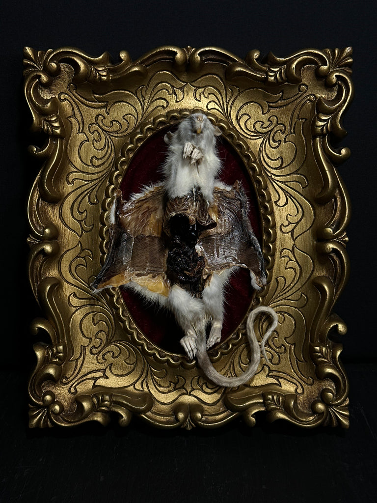 Real professionally mummified flayed rat mounted on a burgundy velvet backdrop. Displayed on an upcycled vintage frame measuring approximately 9" by 7 1/2". Has a screw slot on the back to hang it on your wall!