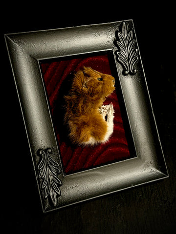 Real professionally mummified guinea pig mounted on a burgundy velvet backdrop. Displayed on a repurposed vintage frame that measures approximately 7" by 5.5" by 1.5". Has a sawtooth picture hook installed on the back to hang it on your wall!