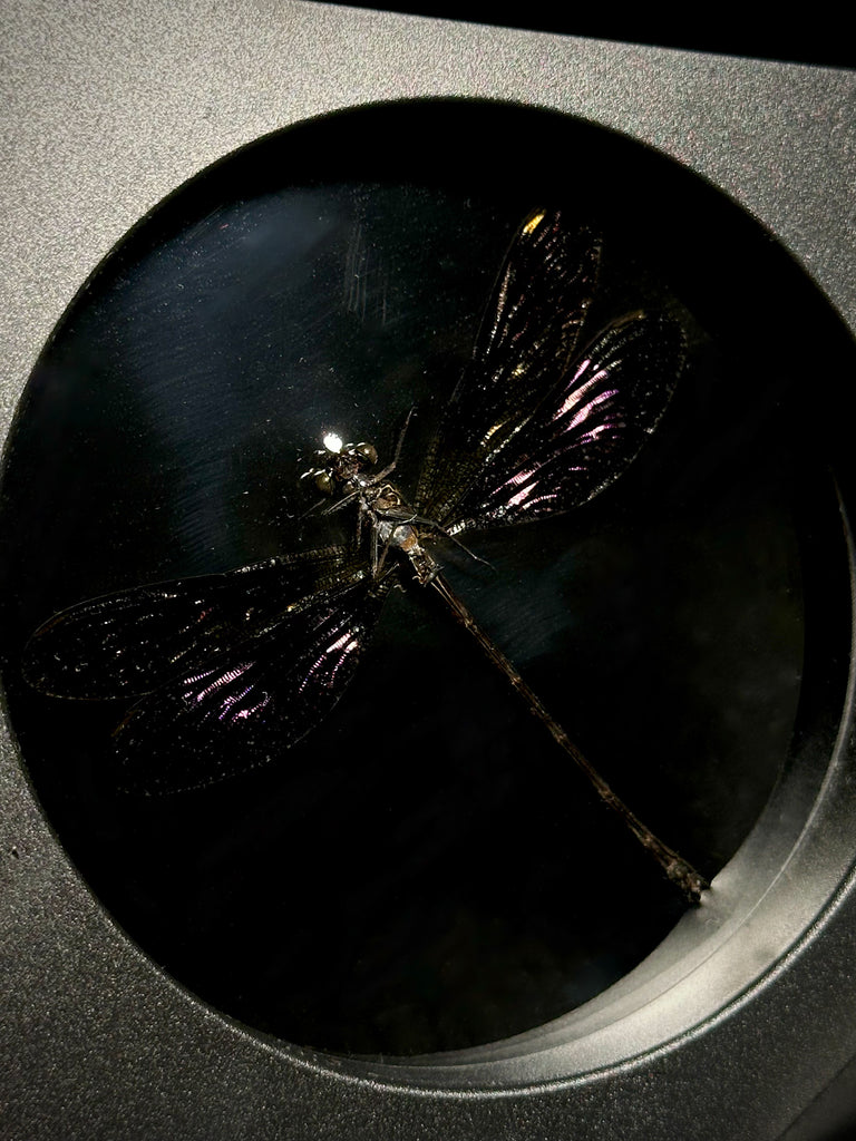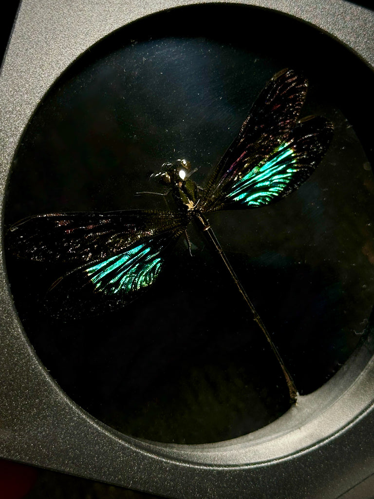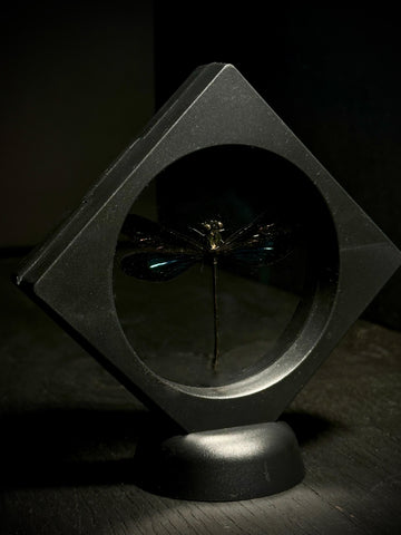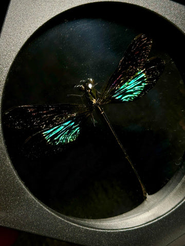 Real Sudanese Gossamerwing damselfly dry preserved and mounted in a 3" X 3" plastic frame with stand.