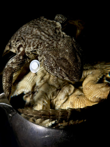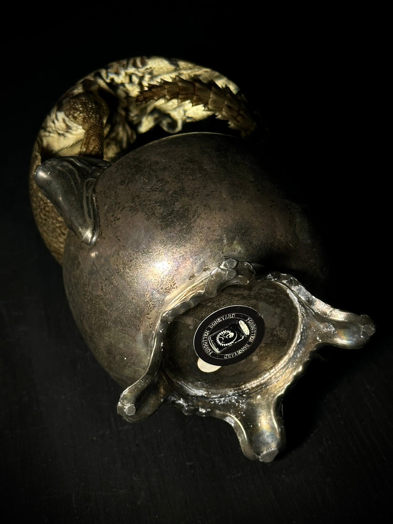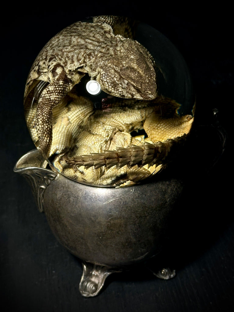 Real uromastyx preserved in fluid and sealed inside of a 4" glass globe with an antique silverplate creamer base.