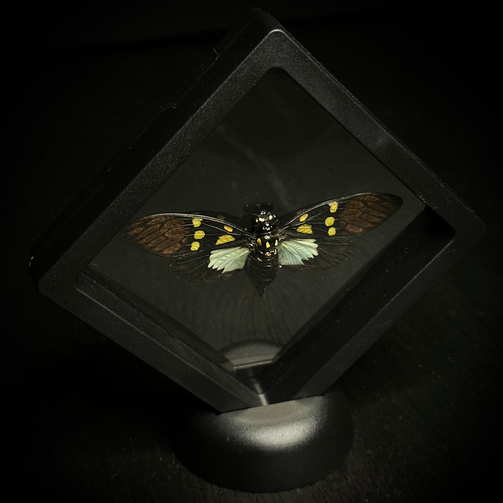 Real Aqua Spotted cicada dry preserved and mounted in a 3" X 3" plastic frame with stand.