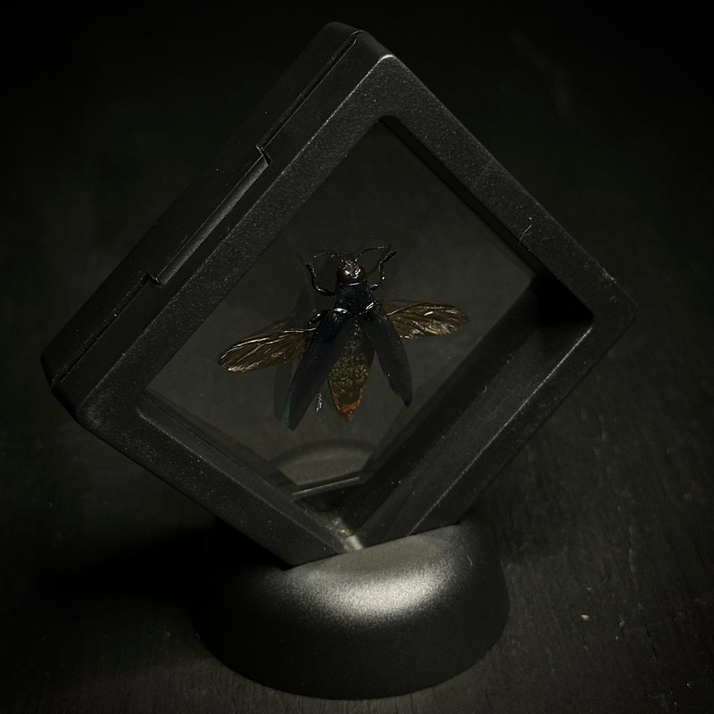 Real Asian Jewel beetle dry preserved and mounted in a 2.5" X 2.5" plastic frame with stand.
