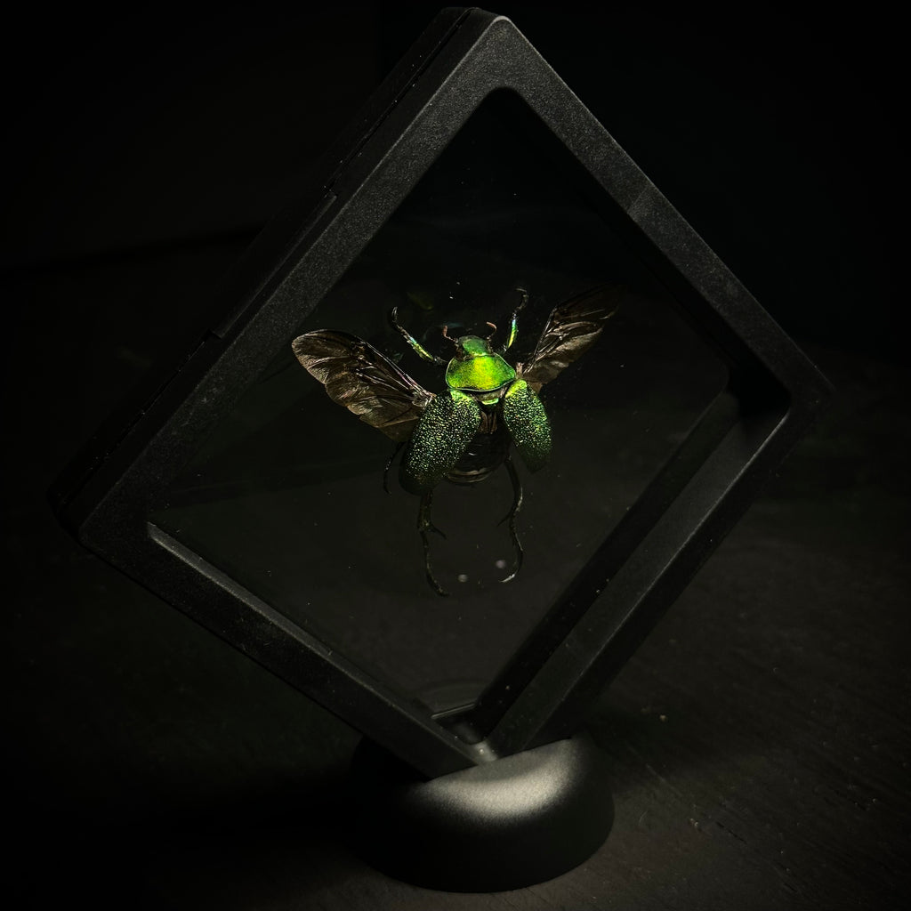Real Shining Leaf chafer dry preserved and mounted in a 3" X 3" plastic frame with stand.