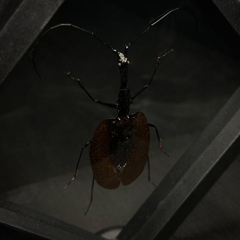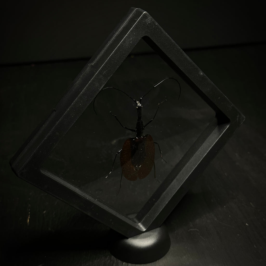 Real Violin beetle dry preserved and mounted in a 5" X 5" plastic frame with stand.
